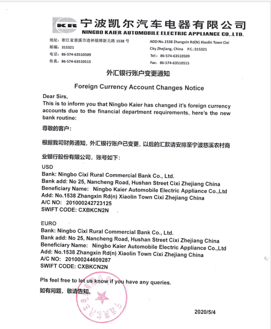 尊敬的客戶: 根據(jù)我司財(cái)務(wù)通知,外匯銀行賬戶己変更,以后的,以后的匯款請(qǐng)安排至寧波慈溪農(nóng)村商業(yè)銀行股份有限公司